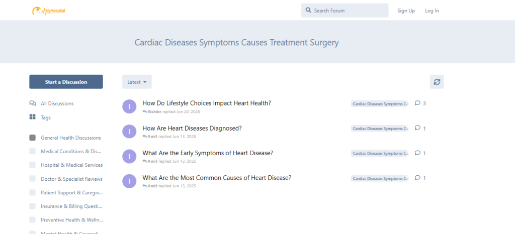 The MyHospitalNow Cardiac Diseases: Symptoms, Causes, Treatment & Surgery forum category is a supportive community space where patients, caregivers, and families can ask questions, share experiences, and learn from others dealing with heart health challenges.
