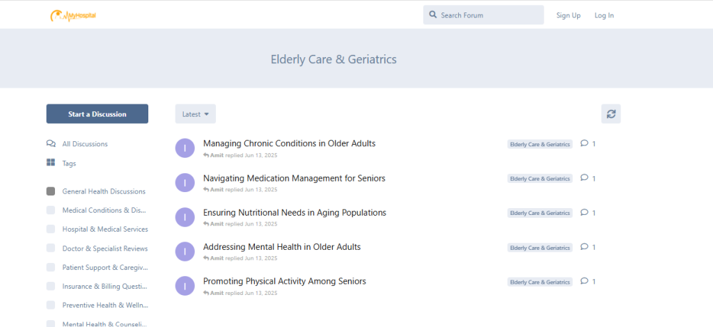 The MyHospitalNow Elderly Care & Geriatrics forum category is a supportive community space where caregivers, family members, and elderly patients themselves can ask questions, share experiences, and receive practical help related to aging and senior health concerns.