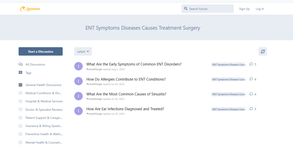The MyHospitalNow ENT: Symptoms, Diseases, Causes, Treatment & Surgery forum category is a supportive community space where patients, caregivers, and families can ask questions, share experiences, and learn from others dealing with ENT‑related concerns.