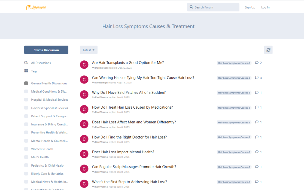 The MyHospitalNow Hair Loss: Symptoms, Causes & Treatment forum category is a supportive place where patients, caregivers, and individuals concerned about hair loss can ask questions, share personal experiences, and learn from others facing similar challenges.
