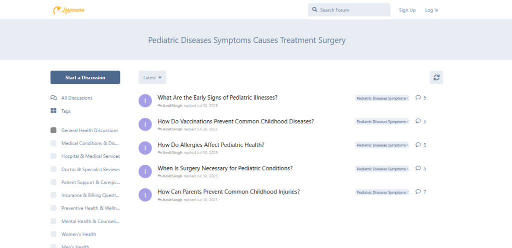 The MyHospitalNow Pediatric Diseases: Symptoms, Causes, Treatment & Surgery forum category is a supportive space where parents, caregivers, and families can ask questions, share experiences, and learn from others dealing with pediatric health issues.