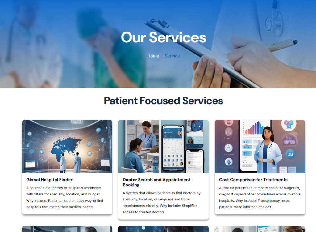 This service helps patients find hospitals based on location, specialization, and treatment needs. Patients can explore multiple hospitals without visiting many different websites.